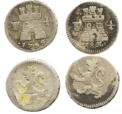 Lot of 2 Potosi, Bolivia, 1/4R, Charles IV, 1799 and 1802. KM-82. 1.7 grams total. Good details but no better than Fine, some toning, somewhat scarce as non-salvage.