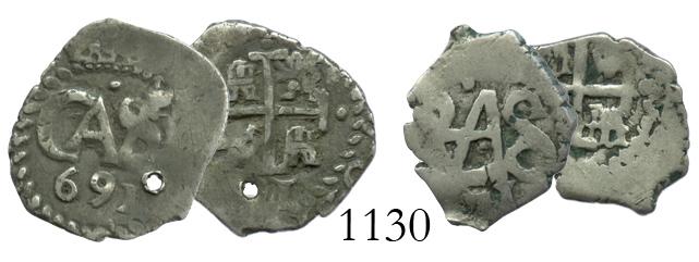 Lot of 2 Potosi, Bolivia, cob 1/2 reales, 1691 (holed) and 171?. 1.2 and 1.5 grams each. The 1691 very broad and rather nice (toned XF) but holed, the other coin with nearly full monogram and cross (Fine) but last digit of date not visible. Pedigreed to the Mark Bir collection.