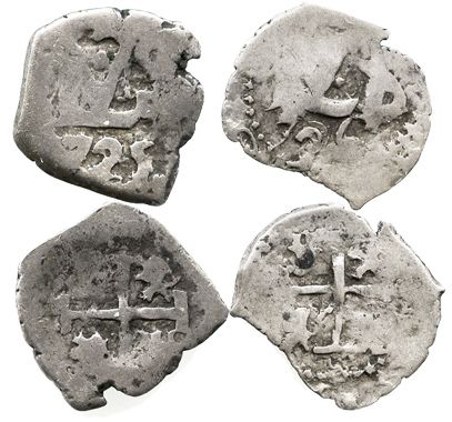 Lot of 2 Potosi, Bolivia, cob 1/2R, Louis I, 1725 and 1726. S-P43b; KM-32. 2.4 grams total. Traditionally scarce type-coins, the 1/2R are useful in proving the Louis I attribution for each date (both posthumous), the 1725 in this case with bold date and nearly full monogram but the 1726 a bit less distinct, both nicely toned and no worse than Fine, with nearly full crosses, also both desirably pedigreed. The 1725 is pedigreed to the Ponterio auction of February 1993 (lot #1135), and the 1726 is pedigreed to the Paul Karon collection (Ponterio, March 1990), lot #1149.