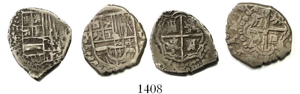 Lot of 2 Potosi, Bolivia, cob 1R of Philip IV, assayers T (ca. 1620) and E (1651-2). KM-12a. 6.89 grams total. Nicely toned and well-detailed AVF (both), good full shields and crosses.