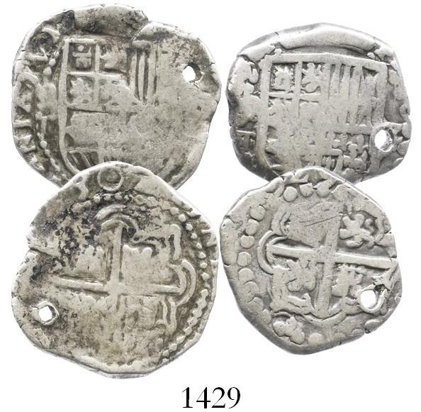 Lot of 2 Potosi, Bolivia, cob 2R, assayer T, dated 1629 and 1630 (rare). S-P26; KM-14a. 6.4 and 5.4 grams. Both with clear assayers and dates (the 1630 bold) and Fine with peripheral holes.