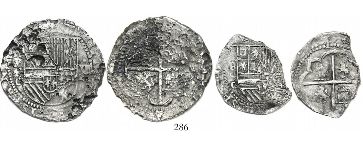 Lot of 2 Potosi, Bolivia, cob 8 and 4 reales, Philip II, assayer C under erasure, very rare. 31.22 grams total. Philip II assayer C is among the rarest of Potosi issues, and both of these coins display the assayer quite clearly, along with nice shields and a bold cross on the 4R; but corrosion on the surfaces and edges of these coins makes them hard for a specialist to appreciate. Nevertheless, contrasting toning and other good details make both coins great for study despite the corrosion. Recovered from: Unidentified ca.-1590 wreck off the Yucatán peninsula of Mexico