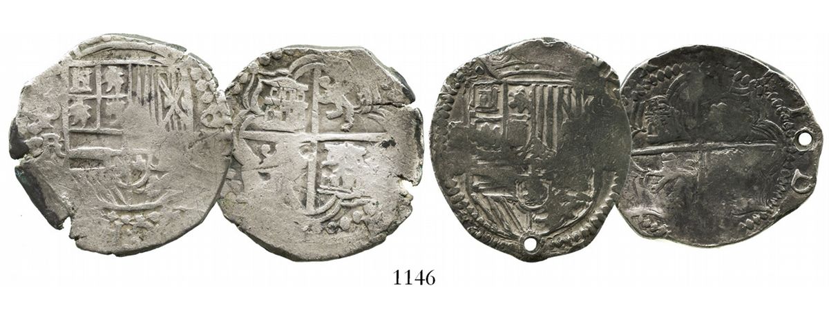 Lot of 2 Potosi, Bolivia, cob 8 reales, Philip II and III, assayers B (5th period) and R (curved leg