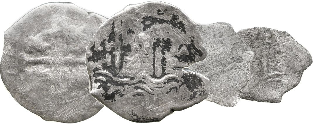 Lot of 2 Potosi, Bolivia, cobs: 8R 1679(V or C) and 2R 1670(E). KM-26. 18.6 grams total. Both corroded, the 8R worn and scratched, the 2R very thin, but interesting in that the 8R certificate says "Santa Cruz" and the 4R tag says "Isla de Muerto Shipwreck," as both were marketed before the name of the wreck was known. With Sedwick certificate from 1997 (8R) and HRR tag #02411 (4R). Recovered from: Consolacion, sunk in 1681 off Santa Clara Island, Ecuador