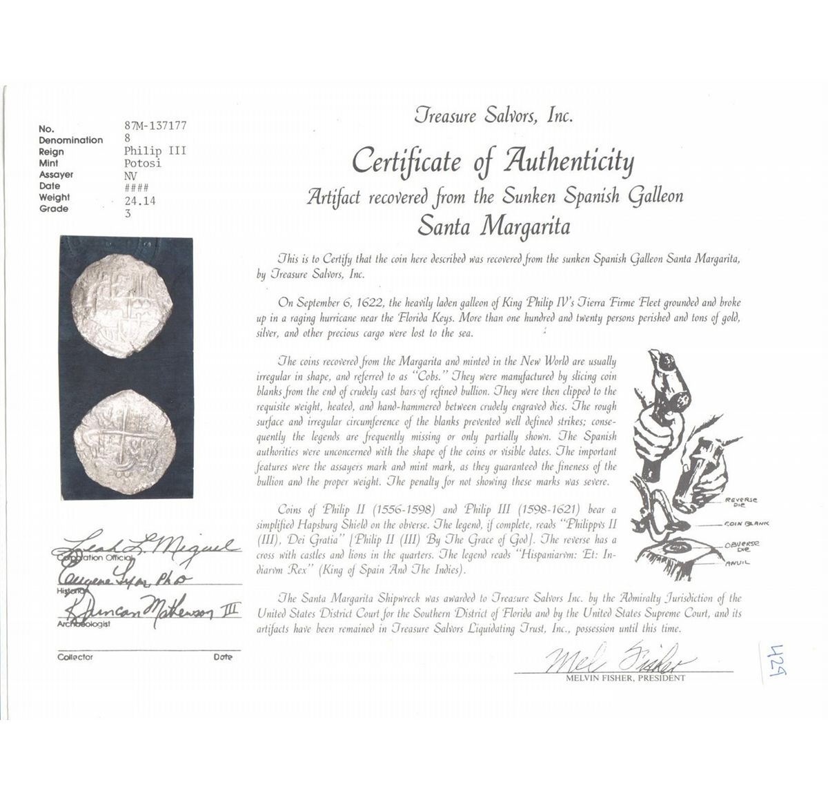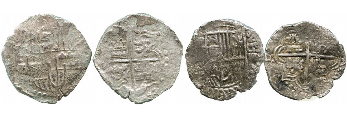 Lot of 2 Potosi, Bolivia, cobs of Philip III (assayers not visible): one 8R Grade 3 (Grade-2 quality) and one 4R Grade 2. 37.0 grams total. The 8R solid and with good full cross but silvery and surface-corroded, the 4R with good full cross and shield and nice toning. With Fisher photo-certificate #87M-137177 for the 8R and tag #8963 for the 4R (no certificate). Recovered from: Santa Margarita, sunk in 1622 west of Key West, Florida
