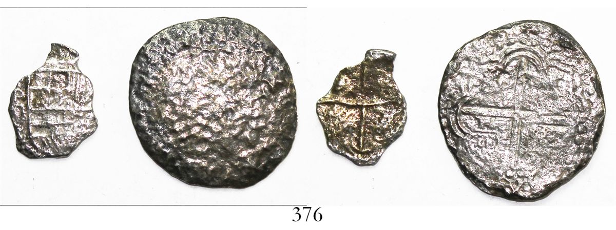 Lot of 2 Potosi, Bolivia, cobs (one 8R and one 2R), Philip III, assayers not visible, Grade 4, with tags but no certificates. 15.98 grams total. Clear shields and crosses despite heavy corrosion, mostly toned. With Fisher tags #82-177 and 82-138. Recovered from: Atocha, sunk in 1622 west of Key West, Florida