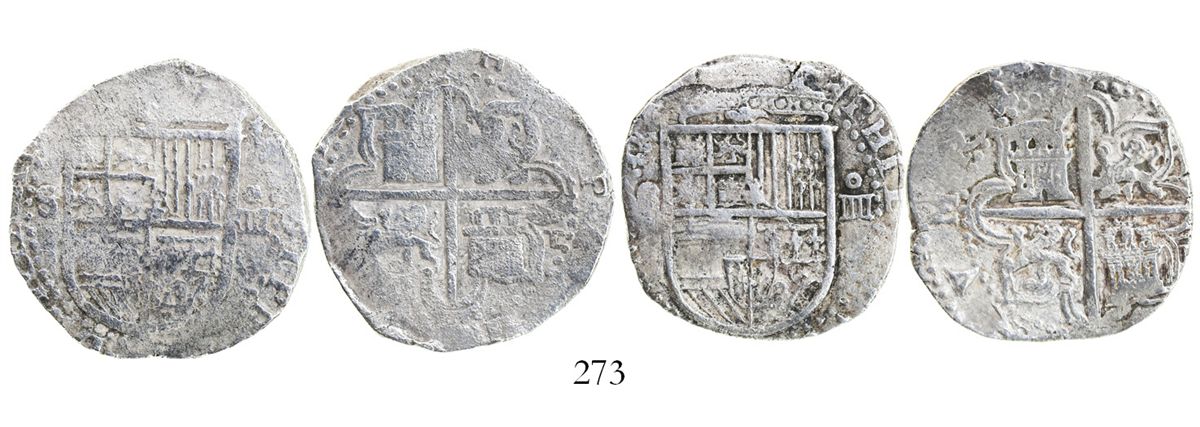 Lot of 2 Seville, Spain, cob 4 reales, Philip II, assayer Gothic D at 4 o'clock outside tressure aro