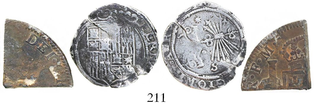 Lot of 2 Spanish / Spanish colonial coins cut or circulated in the early U.S. (ground finds): Seville, Spain, 1 real, Ferdinand-Isabel, assayer * on reverse; and 1/4 cut of a Mexican bust 8 reales of Charles III, assayer FM. 9.06 grams total. The Seville piece is toned Fine with edge-cracks, and the Mexican cut piece is dark and encrusted VF. The former is rather early for circulation in the U.S. but the latter is quite typical (and popular among collectors).