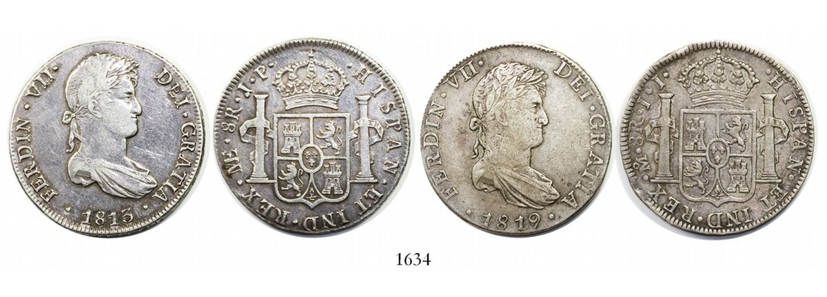 Lot of 2 Spanish colonial bust 8 reales of Ferdinand VII: Mexico 1819JJ, and Lima 1813JP. 54.00 grams total. Nice VF with light toning and traces of luster.