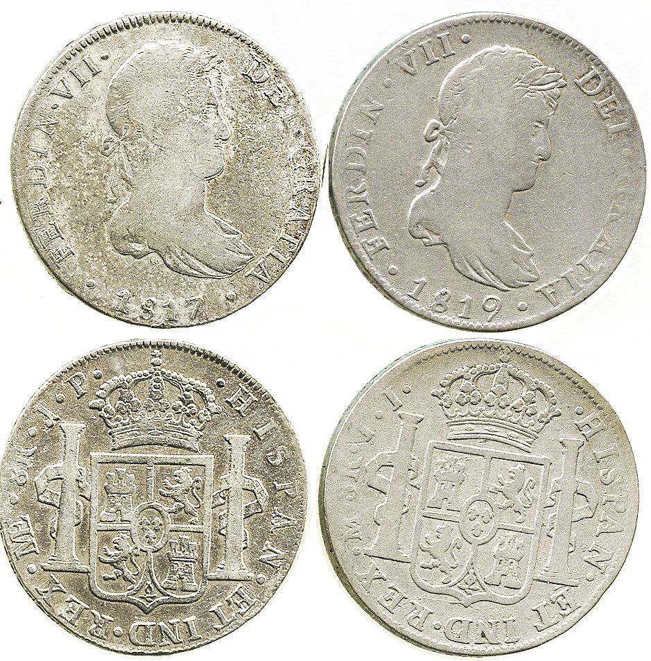 Lot of 2 Spanish colonial bust-type 8R of Ferdinand VII: Mexico City, Mexico, 1819JJ; and Lima, Peru, 1817JP. 52.5 grams total. Both Fine without toning.