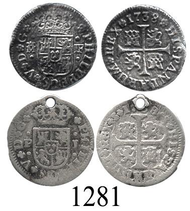 Lot of 2 Spanish milled ½ real "quarter pistareens" of Philip V: Madrid, 1738PJ; Seville, 1738JF. 1.2 and 0.8 gram. The Madrid piece dark and lightly corroded from unspecified salvage (VF details), the Seville piece holed VG, but both with clear details and fully collectible.