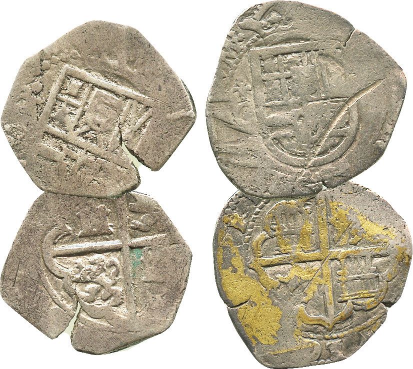 Lot of 2 Toledo, Spain, 2R of Philip II-III: assayer C and not visible. 13.4 grams total. The assayer-C piece with good full shield and cross, clear oT-C to left, AVF with old scratches and gilt reverse; the other smaller and less well-detailed, with edge-split but no problems; both lightly toned.