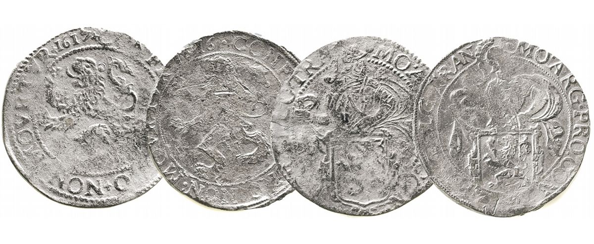 Lot of 2 United Netherlands "lion" daalders: 1616 Overijssel and 1617 Utrecht. 45.9 grams total. Silvery and lightly to moderately corroded but one with bold date and the other rather solid. One with certificate from the salvagers. Recovered from: Campen, sunk in 1627 off the Isle of Wight, south of England