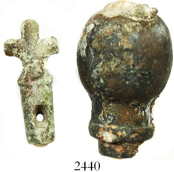 Lot of 2 bronze/brass artifacts: sword pommel and stop-cock. 313.5 grams and 34.3 grams, 2" to 2-1/2". The pommel very solid and heavy but with appended encrustation, the stop-cock of trifid design and nicely patinated. From the Unidentified late-1600s wreck (probably French) in the English Channel.