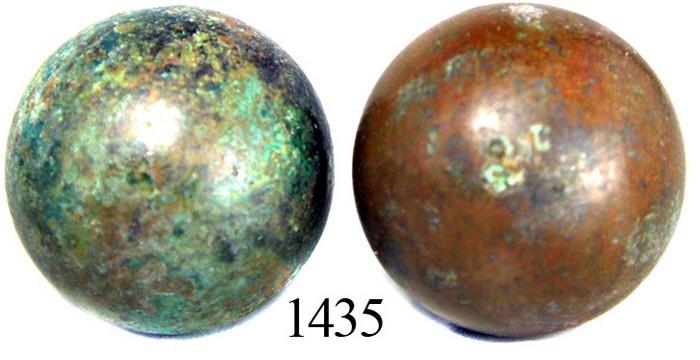 Lot of 2 bronze musketballs, rare. 63.8 grams total, each ¾" in diameter. In all our years of dealing in treasure artifacts we have never seen musketballs made of bronze, but since they made cannonballs out of bronze on occasion, then the same material for these smaller balls must not be unique and probably served as "high end" ammunition for wealthy pistol-owners. One is cleaned and evenly brown in color, the other patinated as found, both perfectly intact. From the Capitana El Rubí and pedigreed to Art McKee's Sunken Treasure Museum, with certificate.