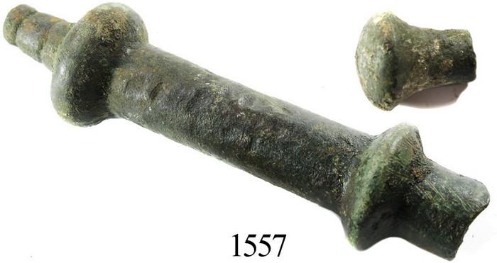 Lot of 2 bronze pestle pieces. 650 grams total, up to 5½". Most of a heavy bronze pestle (for crushing and mixing food and medicine) plus the tip of another, both nicely patinated. Found in a Spanish colonial area in the southern Caribbean, ca. 1590.