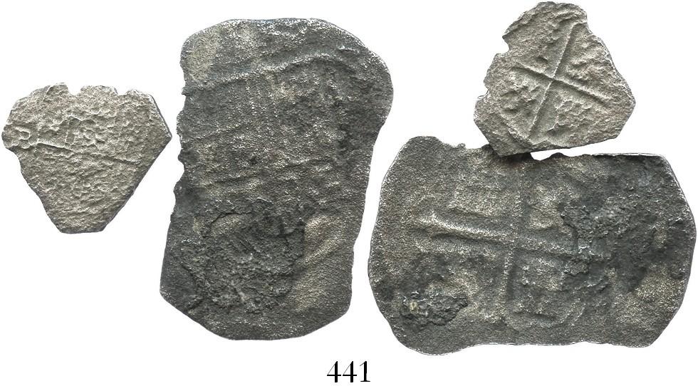Lot of 2 cobs: Mexico 8R Philip III assayer not visible, and Seville 2R Philip III assayer B. 11.3 grams total. Both thin and heavily corroded but with full crosses and shields. From the "Rill Cove wreck," sunk ca. 1618 off Cornwall, England