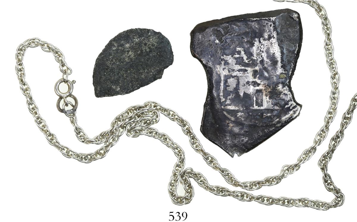 Lot of 2 coins: One Mexico cob 8R Philip V assayer J with loop and chain; one puffy black "encrusted coin." 36.78 grams total. The 8R in this lot is decent, with good cross, interesting shape, no corrosion but worn, with patchy dark toning, its once soldered-on loop and chain now separate (minor repair necessary, or trash the chain and keep the coin); the other piece is a totally oxidized "blackie" coin fragment. The 8R with 1989 certificate from the salvager, and the encrusted coin with Cobb Coin Co. (Fisher) tag #13150. Recovered from: Spanish 1715 Fleet, east coast of Florida