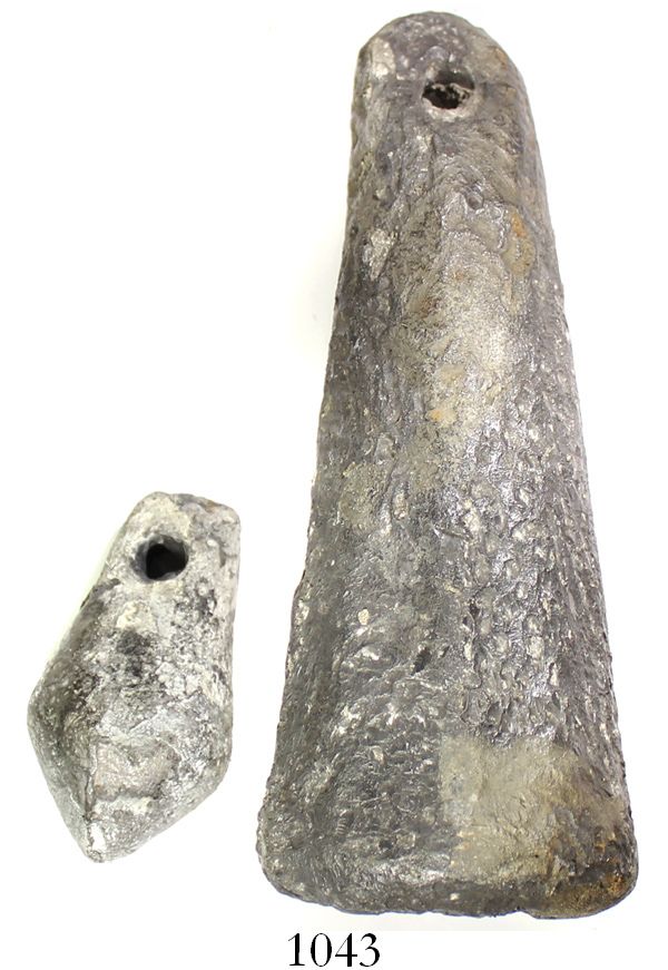 Lot of 2 lead sounding weights (different designs). About 3.7 kg and 0.5 kg, the larger one 7" tall and 3" in diameter and the smaller one 3" tall and 1-1/2" in diameter. The larger of this pair is a flat-bottomed cone but the smaller one is more like a plum-bob with pointed bottom, both with hole at top and both used for determining depth at sea, some very light encrustation here and there. From the mid-1500s "Pewter Wreck," with Global Marine Exploration photo-certificate #PC01306 and 2303. Recovered from: "Pewter Wreck," sunk in the mid-1500s off Santo Domingo