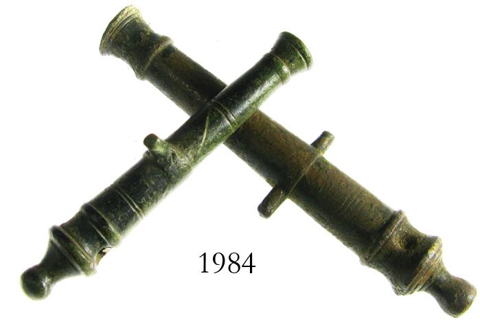 Lot of 2 miniature brass cannons, probably 1700s-1800s. 48.5 grams total, 2-1/2" to 3-1/8" long. Two tiny but functional cannons, both dark and patinated, the smaller one slightly more ornate but both presumably scale models.