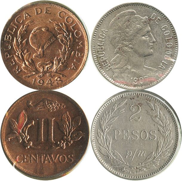 Lot of 2 miscellaneous Colombian minors: copper-nickel 2 pesos papel moneda 1907AM, and copper 2 centavos 1948. 6.0 grams total. The 1907 is lustrous XF; the 1948 is BU with original luster and color, crude rims (as made).
