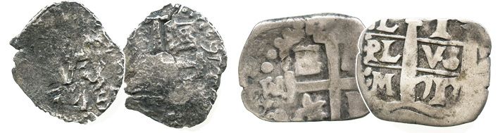 Lot of 2 small Lima, Peru, cobs of Philip V: 1R 1711M and 1/2R 1746. 2.3 grams total. The 1R is well-detailed AVF but clipped; the 1/2R is lightly corroded but has a full date; therefore both are underweight but decent, with good toning. The 1/2R was reportedly salvaged from a wreck off St. Augustine, Florida.