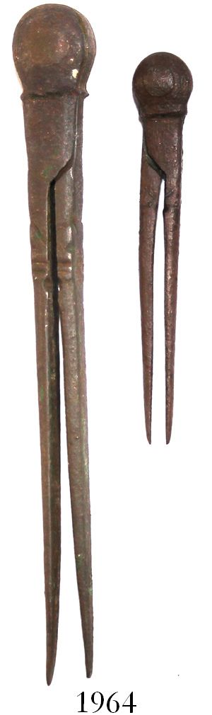 Lot of 2 small, brass navigational dividers in working order, early 1600s, found in England. 22 grams total, 2" and 3-1/2" long. Small but perfectly intact pieces with sharp points (one slightly bent) and moving arms, all dark bronze in color.