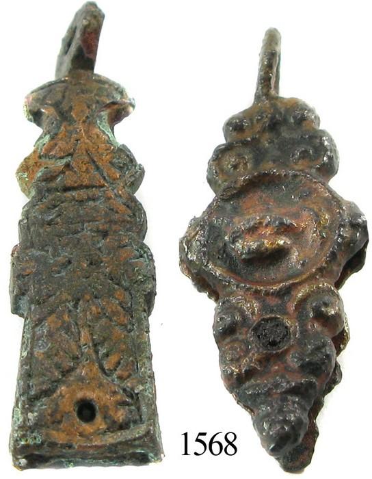 Lot of 2 small bronze pendants. 20 grams total, each about 1¾". Two coppery fobs with loops at top and slits in bottom, exact purpose unknown, nicely patinated. Found in a Spanish colonial area in the southern Caribbean, ca. 1590.