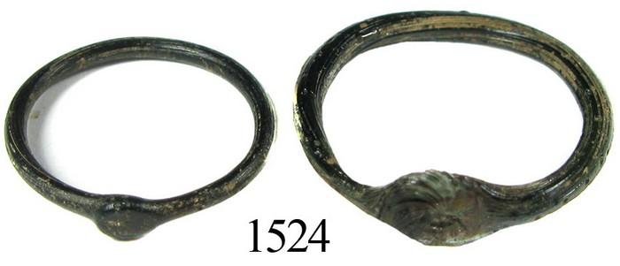Lot of 2 small glass rings. 0.5 gram total, ½" and ¾" in diameter. Two tiny rings in black glass, very thin and delicate (rare to be intact), with small oval panels at top, the smaller one plain but the larger one with swirled pattern that is reminiscent of the famous "sun-over-mountains" design on Guatemalan coins of 3 centuries later! Found in a Spanish colonial area in the southern Caribbean, ca. 1590.