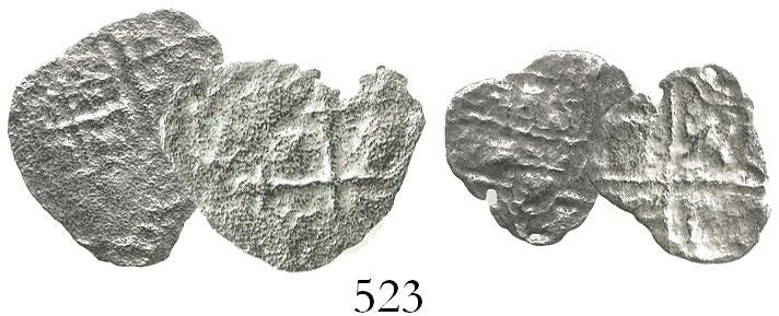 Lot of 2 small silver-cob fragments (Mexico 2R[?] and Potosi 1R[?]), Grade 5. 2.0 grams total. Recognizable details despite corrosion and thinning. With Fisher certificates #00M-57172 and 57268. Recovered from: Santa Margarita, sunk in 1622 west of Key West, Florida
