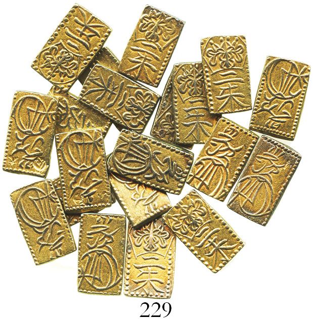 Lot of 20 Japanese 2 shu (ni-shu gins, "samurai coins") of the mid-1800s. 32.6 grams total. Typically quality (problem-free XF-AU), popular for jewelry and souvenirs, struck in low-grade gold but decent in color.