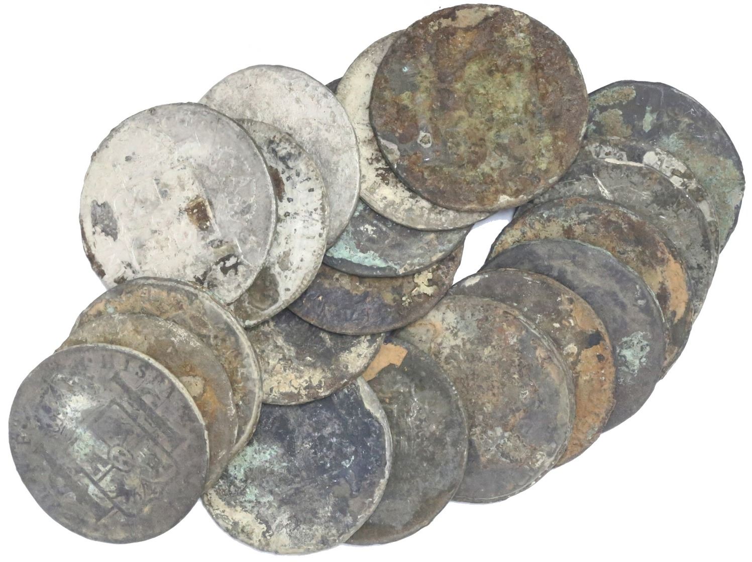 Lot of 20 Spanish colonial bust 8 reales of Charles III. 415 grams total. Corroded and encrusted as found, all with at least some design elements showing including one dated 1783. Recovered from: Cazador, sunk in 1784 off New Orleans, Louisiana