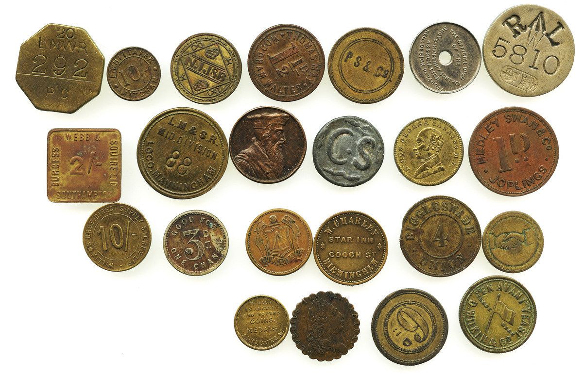 Lot of 23 British copper (mostly) medals and merchant tokens, ca. 1850-1899. 141.6 grams. Wide variety of sizes and designs and metals, generally F-VF but a few better. With attribution tags from the previous owner.
