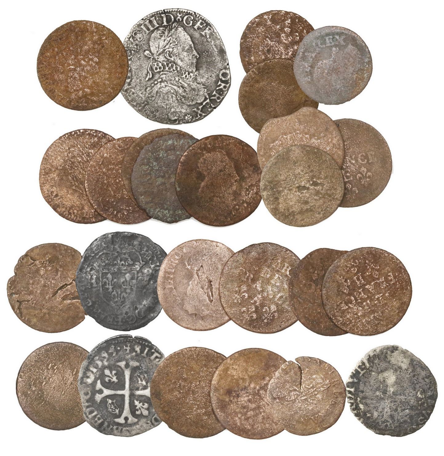 Lot of 25 French minors, including a 1575 silver teston of Henry III and 24 copper/billon liards, do