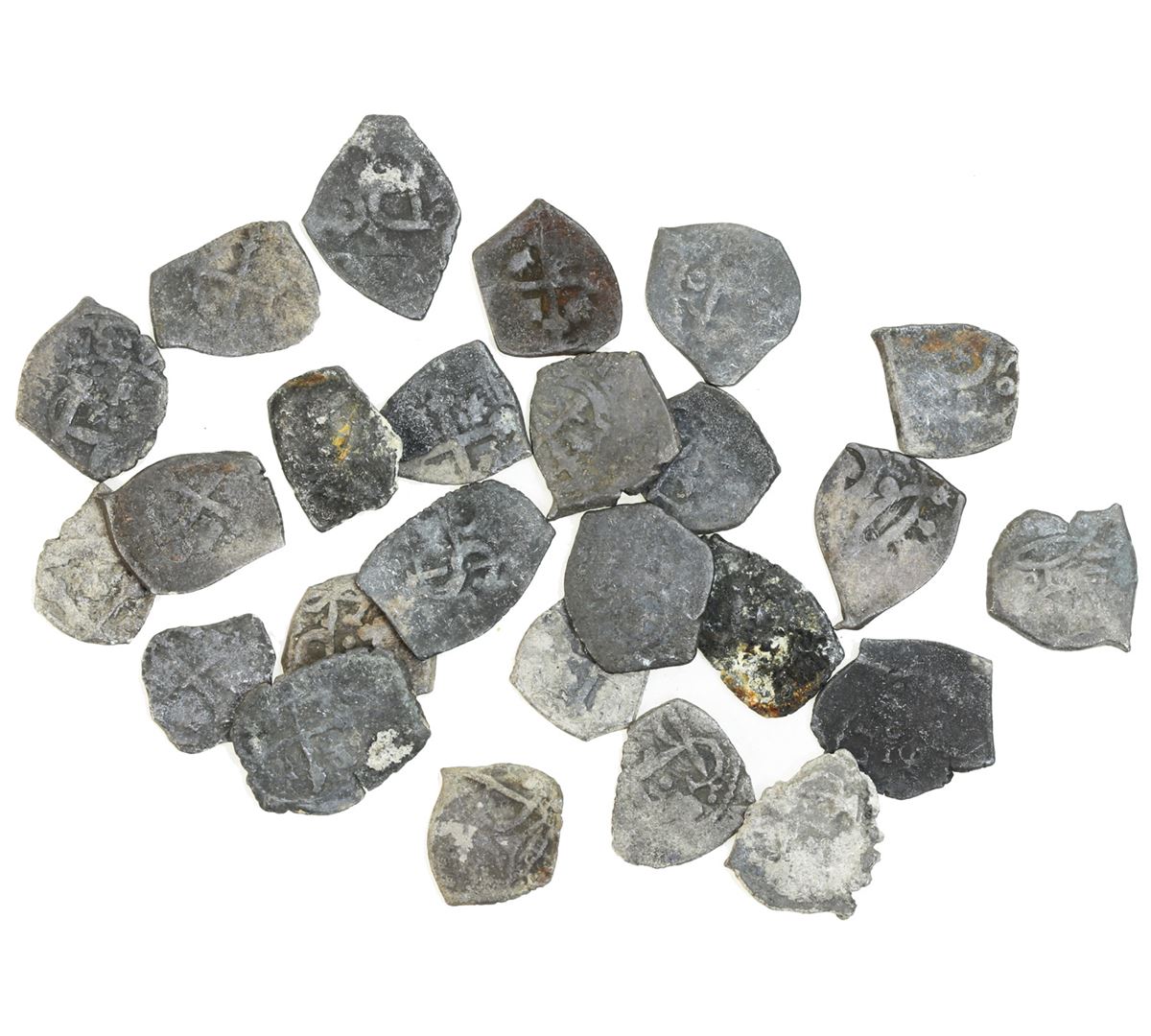 Lot of 25 Mexico City, Mexico, cob 1/2 reales, Charles II and Philip V, various assayers (where visible), uncleaned (as found). 35.12 grams total. Solid coins with generally nice crosses and shields, little or no corrosion, mostly intact surfaces, some encrusted, just a nice group of untouched Fleet cobs. Recovered from: Spanish 1715 Fleet, east coast of Florida