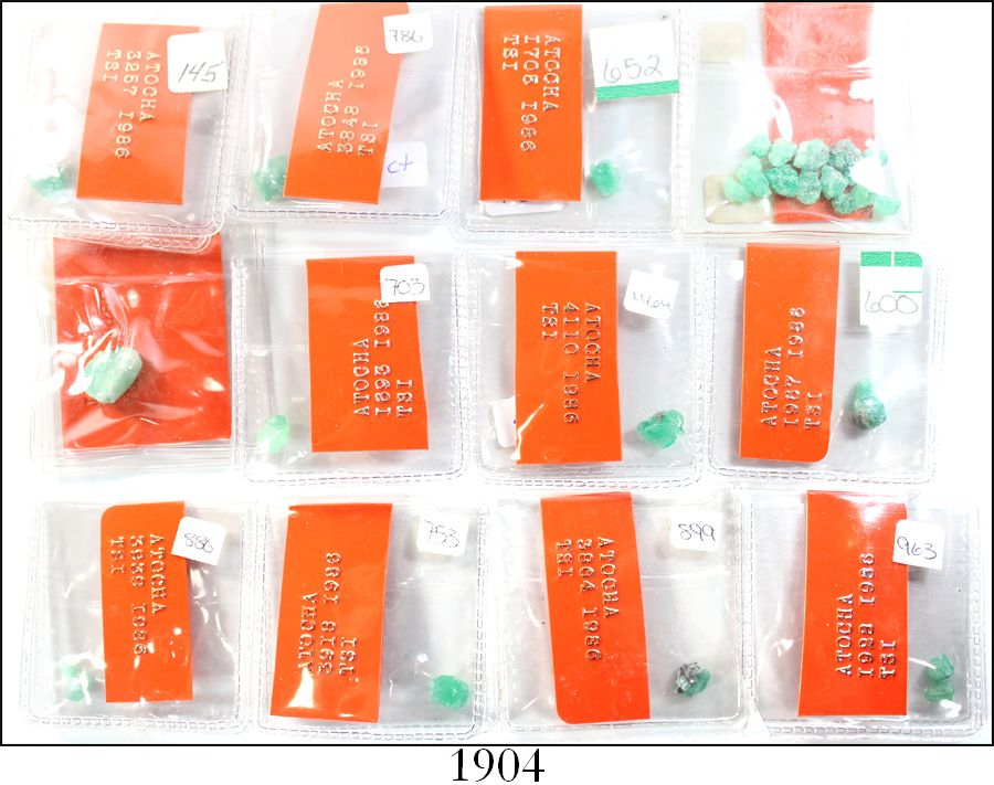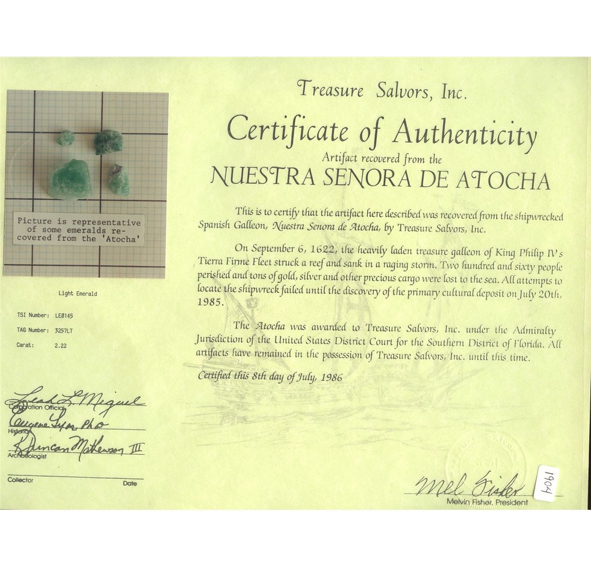 Lot of 25 natural emeralds, ranging from less than a carat to nearly 5 carats, all with original Fisher tags and certificates. Up to 1/2" each. Some with good color and/or translucence, but most washed out and whitish. With Fisher certificates #LE145, 238, 600, 652, 703, 753, 786, 886, 899, 963 (2 pc), 1164 and 1542 (13 pc). Recovered from: Atocha, sunk in 1622 west of Key West, Florida
