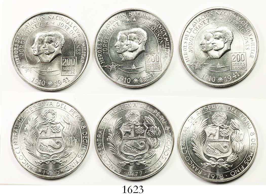 Lot of 3 Banco Central de Reserva del Peru 200 soles de oro, 1976, 1977 and 1978, aviation heroes Chavez and Quinones. KM-262 65.71 grams total. All problem-free BU, struck in .800 fineness.