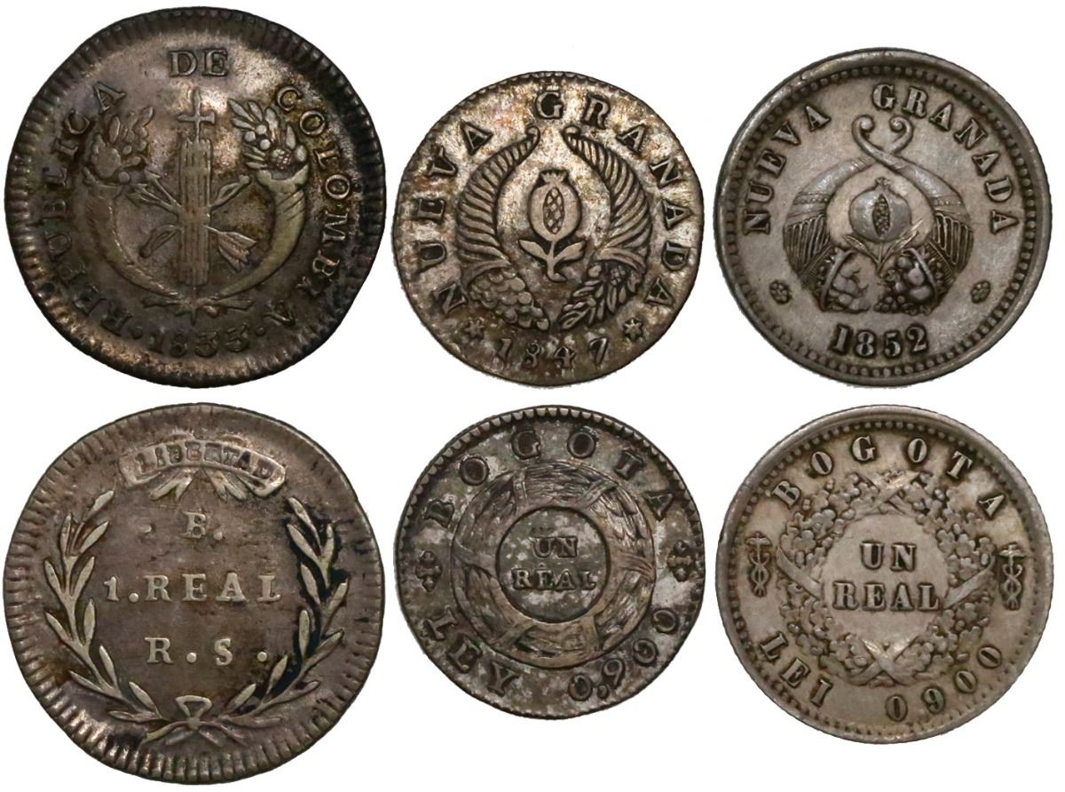 Lot of 3 Bogota, Colombia, 1R: 1833, 1847 and 1852. Restrepo-154.18, KM-87.1; Restrepo-184.2, KM-103; Restrepo-185.2, KM-112. 3.04 grams, 2.34 grams and 2.54 grams. All naturally toned, the 1833 VF+ with light planchet flaws, the 1847 and 1852 both XF.