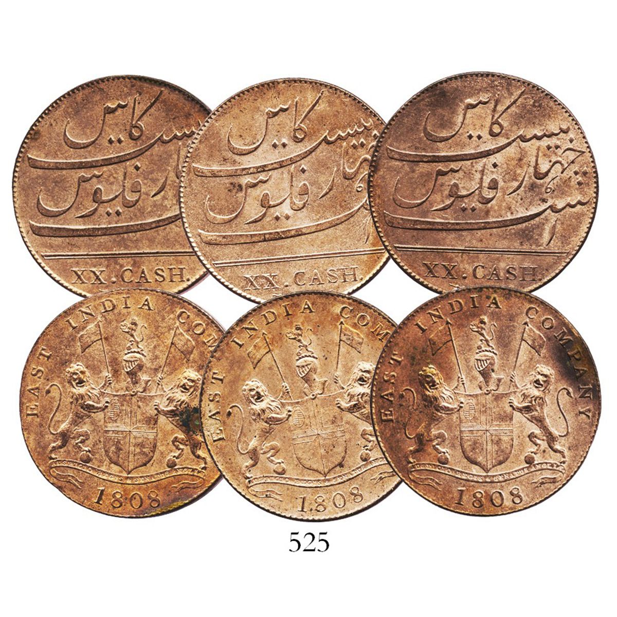 Lot of 3 British East India Co. copper XX cash, 1808. KM-321. 27.8 grams total. Choice, corrosion-free specimens with Mint State details (even lustrous), original copper color, best you can get. Recovered from: Admiral Gardner, sunk in 1809 southeast of England