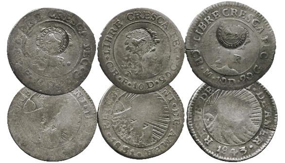 Lot of 3 Costa Rica 1/2R with "lion" countermarks (Type VI, 1849-57) on Central American Republic 1/2R dated 1831E, 1831F and 1843M. . 4.2 grams total.Hosts About Fine and countermarks AVF on average (somewhat unevenly struck), lightly toned, no big problems.