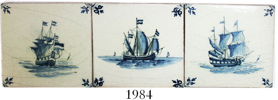 Lot of 3 Dutch blue-on-white porcelain tiles depicting East Indiamen, early 1800s. 966 grams total; each 5" square. Fully intact save for underglaze cracks (which add character), each ship slightly different, perfect for a backsplash accent in a nautical-themed kitchen. With photo-certificate.