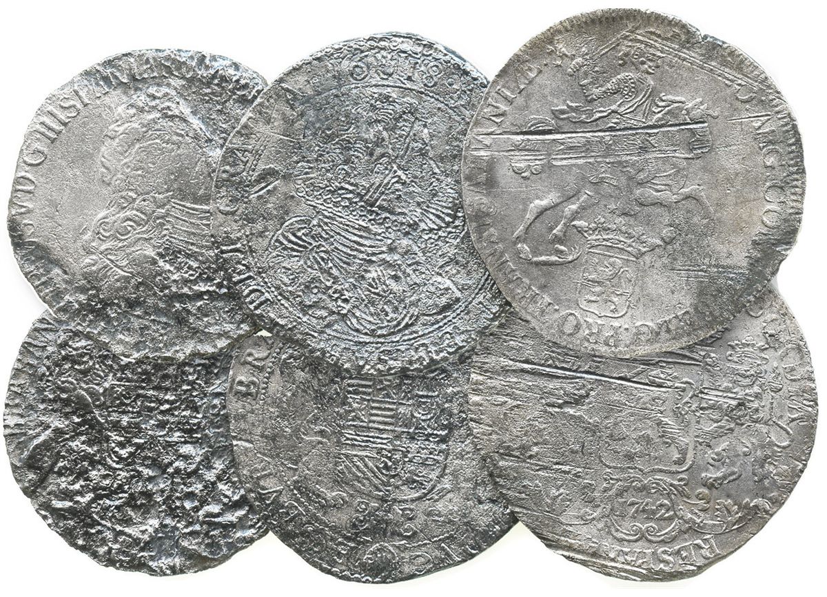 Lot of 3 Dutch ducatoons (various mints): 1618 (Albert & Isabel), 1703 (Philip V) and 1742. 85.4 grams total. Moderately corroded but with clear details (the 1742 even a bit lustrous) and lightly toned, nice mix of 3 different types (both Spanish and United Netherlands). Recovered from: Hollandia, sunk in 1743 off the Scilly Isles, west of England
