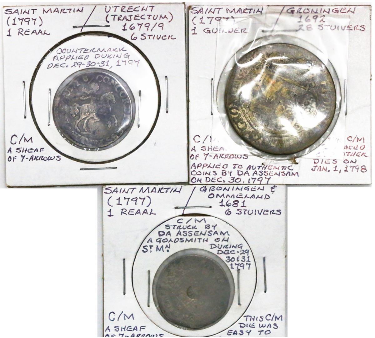 This lot, originally attributed by the consignor to the Caribbean island of St. Martin, consists of three late-1600s Dutch coins (one 1 guilder and two 6 stuivers), all with countermarks showing a sheaf of seven arrows representing the 7 Dutch chambers, attributed to 1693 and applied to show proper value amidst much debased coinage in circulation. The host coins range from Good to Fine with nice toning, each with collector attributions (albeit erroneous) on cardboard holders.