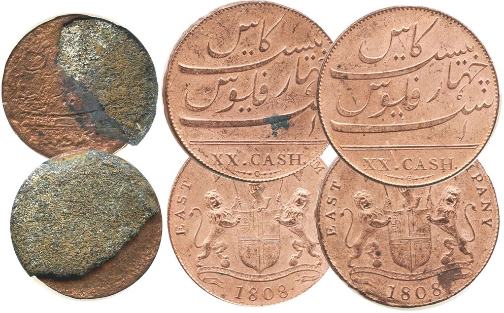 Lot of 3 English East India Co. copper coins of 1808: two XX cash and one X cash with encrustation. 23.7 grams. Both XX cash are top grade, with little or no corrosion and light color, whereas the X cash is corroded but has a thick and interesting crust of encrustation (about 30% of the coin exposed). Recovered from: Admiral Gardner, sunk in 1809 southeast of England