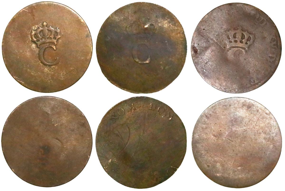 Lot of 3 French colonial copper stampees, large crowned C (1779).