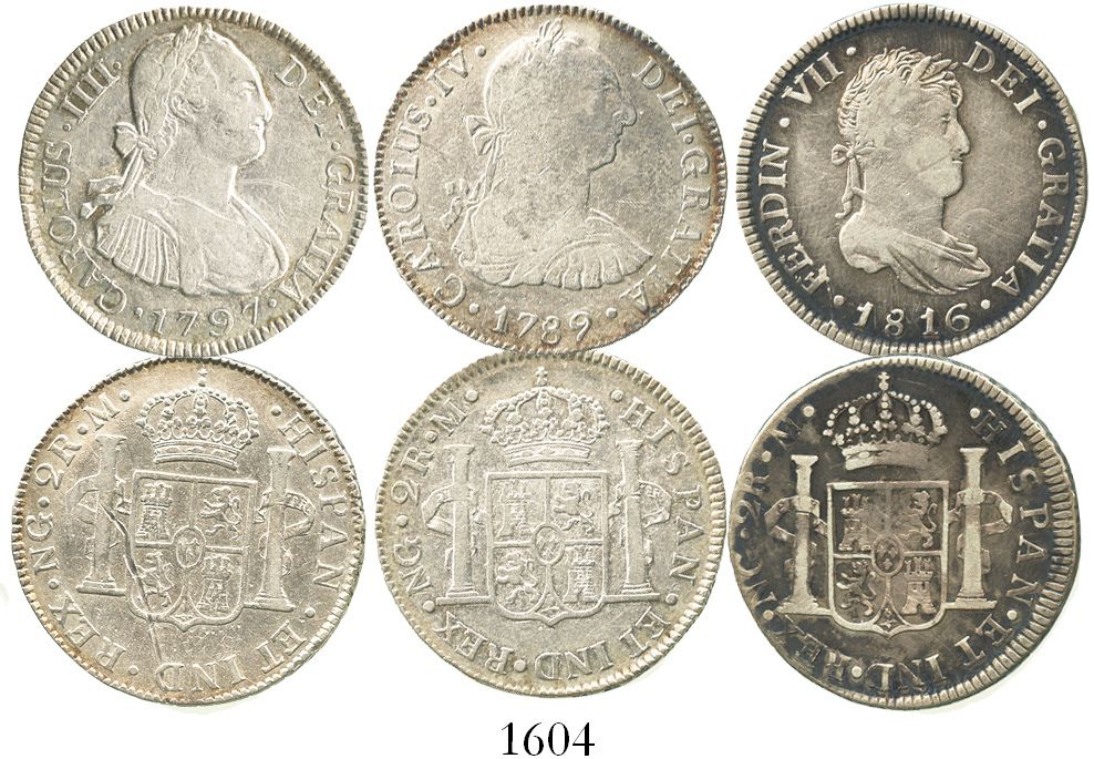 Lot of 3 Guatemala bust 2 reales of Charles IV and Ferdinand VII: 1789M (bust of Charles III), 1797M and 1816M. 19.9 grams total. The 1816 is an attractively toned and problem-free Fine, but the other two are silvery VF with scratches.