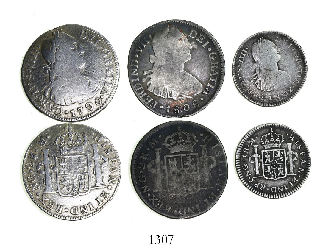 Lot of 3 Guatemala bust-type minors: 2R 1790M Charles IV; 2R 1808M Ferdinand VII (bust of Charles IV); and 1R 1802/1M. 16.20 grams total. About Fine on average, the 1808 deeply toned with rim-nick, the 1790 polished and possibly gilt, and the 1802/1 lightly scratched (but scarce).