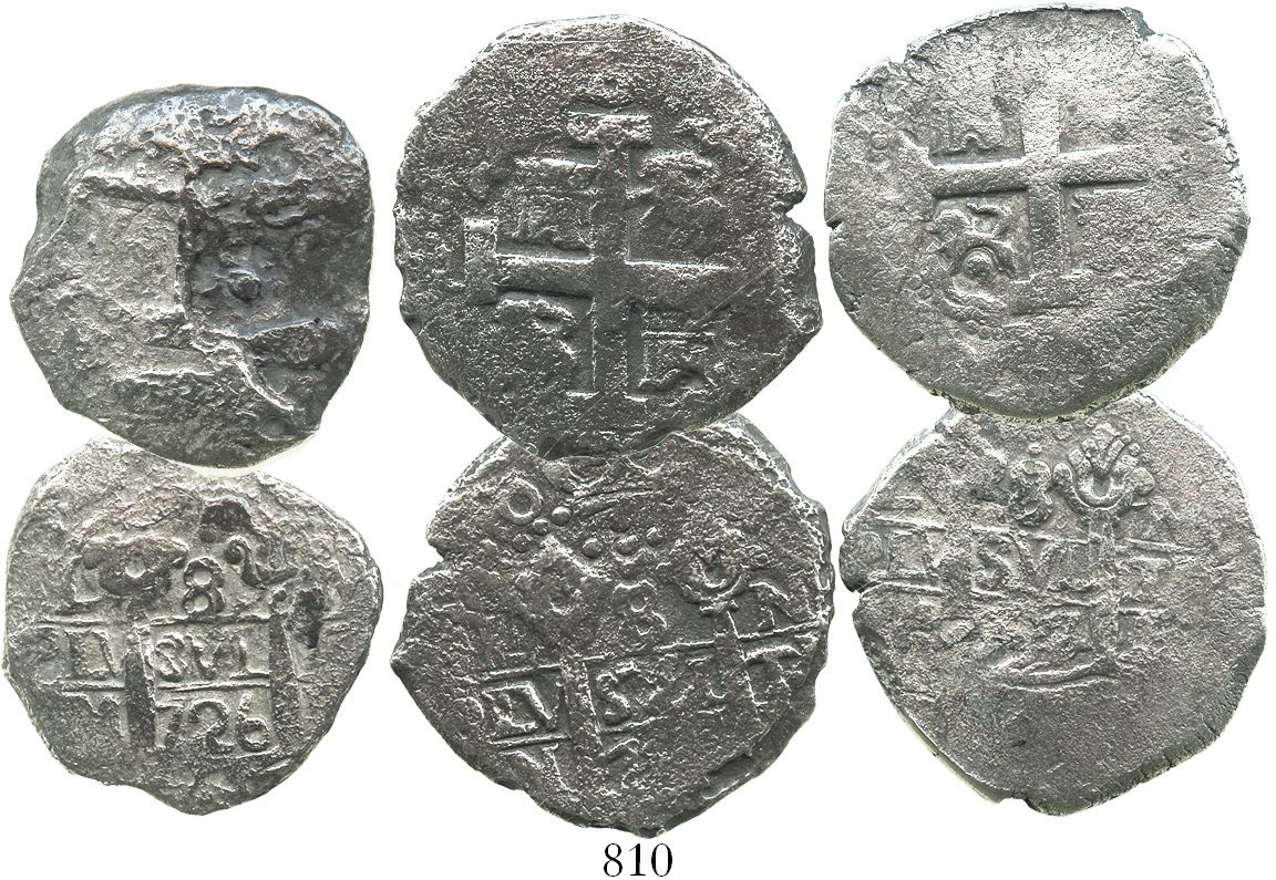 Lot of 3 Lima, Peru, cob 8 reales of Philip V, various dates (where visible). 65.6 grams total. All with good pillars, two with good crosses (partial dates) but the other one (1726M) heavily corroded on the cross side. Recovered from: Princess Louisa, sunk in 1743 off the Cape Verde Islands, west of Africa
