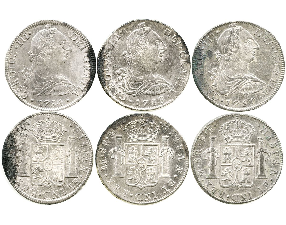 Lot of 3 Mexico City, Mexico, bust 8 reales of Charles III (1780FF, 1782FF and 1784FM).