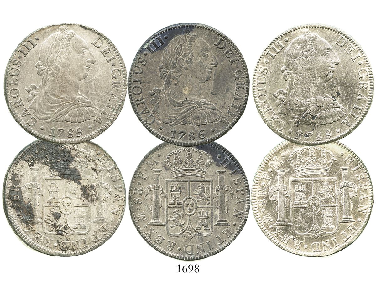 Lot of 3 Mexico City, Mexico, bust 8 reales of Charles III, dated 1785FM, 1786FM and 1788FM.
